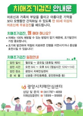이에 광양시치매안심센터는 특별한 증상이 없더라도 60세 이상 어르신의 경우 연 1회 정기적인 치매 조기검진을 받을 것을 권장하고 있다.