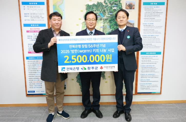 이번 전달은 겨울철 한파와 난방비 부담으로 어려움을 겪는 취약계층의 안전한 겨울나기를 지원하기 위해 마련됐으며, 이날 전달식에는 유희태 완주군수를 비롯해 전북은행 오현권 부행장, 김영필 완주군청지점장이 참석했다.
