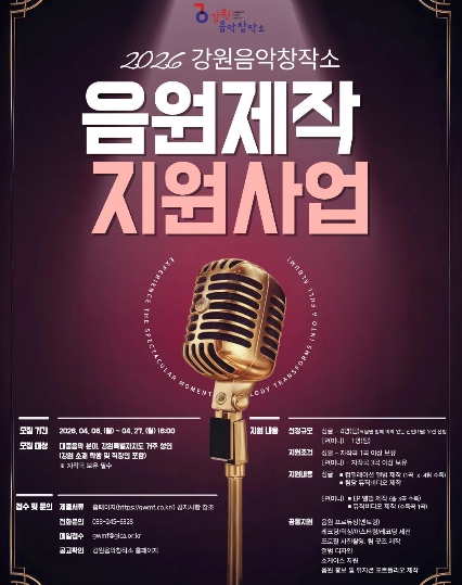 강원음악창작소 관계자는 “음원 제작은 창작자들에게 큰 비용과 노력이 드는 작업인 만큼, 이번 사업이 도내 뮤지션들의 경제적 부담 없이 자신의 음악을 알리는 발판이 되길 바란다”며, “잠재력 있는 신인들이 시장에 첫발을 내디딜 수 있도록 지원을 아끼지 않겠다”고 밝혔다.