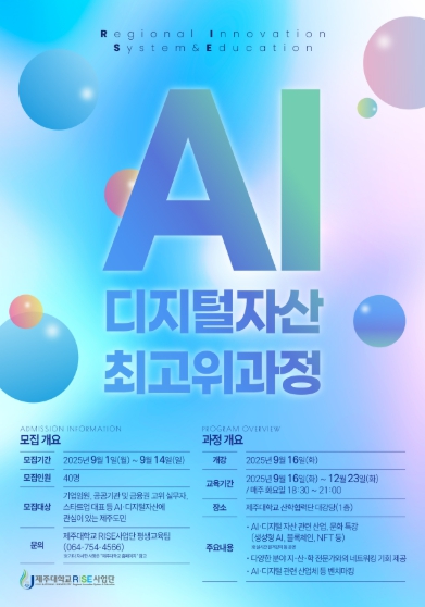 이번 AI·디지털자산 최고위과정 수강생 모집은 9월 14일까지로, 전자우편을 통해 신청할 수 있으며, 문의 사항은 제주대학교 RISE사업단 평생교육팀(064-754-4566)로 문의하면 되고, 기타 자세한 사항은 제주대학교 홈페이지를 참고하면 된다.