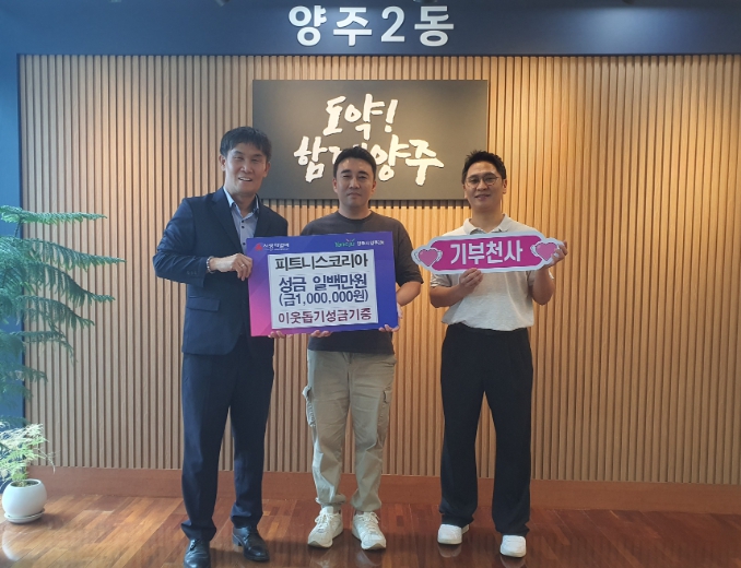 백기철 양주2동장은 "지역사회의 어려운 이웃을 위해 진심 어린 나눔을 실천해주시는 ㈜피트니스코리아에 감사드린다”며 "도움이 필요한 아동과 청소년을 위한 맞춤형 복지 실현에 힘쓰겠다”고 말했다.