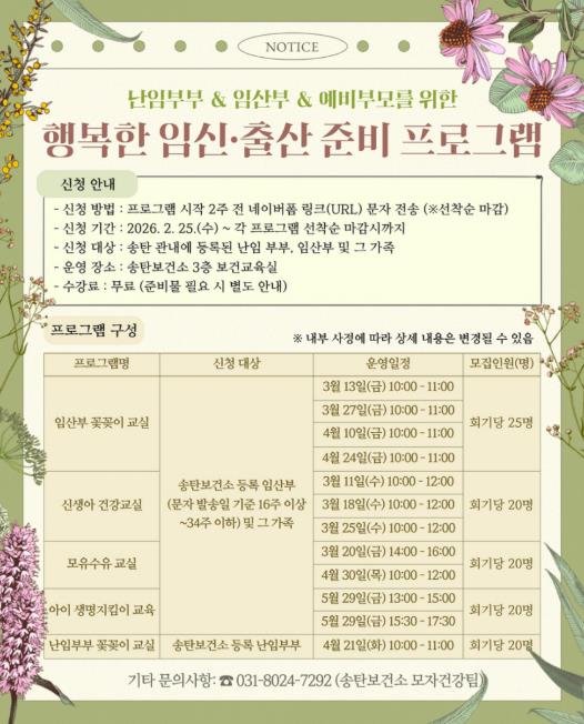 이번 상반기에는 ▲힐링태교 임산부 꽃꽂이 교실 ▲난임부부 꽃꽂이 교실 ▲신생아 건강 교실 ▲모유 수유 교실 ▲아이 생명지킴이 교육 등 다양한 과정이 마련되며, 각 프로그램은 각각의 일정에 따라 운영된다.