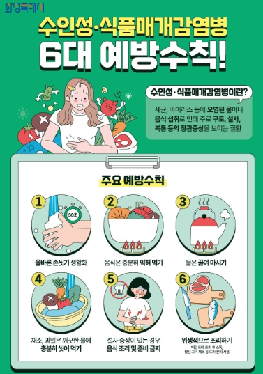 수인성·식품매개감염병 6대 예방수칙으로는 ▲흐르는 물에 비누로 30초 이상 손 씻기 ▲음식은 반드시 익혀 먹기 ▲물은 끓여 마시기 ▲채소나 과일은 깨끗한 물에 씻어 먹기 ▲설사 증상 시 음식 조리 금지 ▲조리기구 용도 구분 등이 있다.