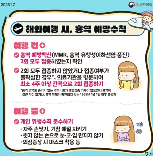 여름철 해외여행 급증에 따라 홍역 감염 예방을 위해서는 ▲ 해외여행 전 MMR 백신 2회 접종 여부 확인 ▲ 미접종자 및 접종력 불확실 시 출국 전 접종 권고 ▲ 해외여행 중 개인위생(마스크 착용, 손 씻기 등) 철저히 지키기 ▲ 귀국 후 3주 이내 발열, 기침, 발진 등 증상 발생 시, 즉시 의료기관 방문 등을 준수해야한다.