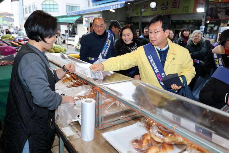 박병규 청장은 이날 민생 경제에 온기를 전하고 지역 상권에 활기를 불어넣기 위해 상인들을 격려하고 온누리상품권으로 제수 등을 구매했다.
