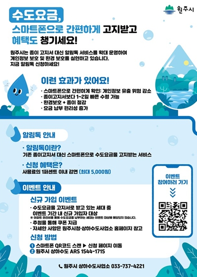 수도요금 알림톡은 카카오톡을 통해 고지서를 받아보는 서비스로, 별도의 앱 설치 없이 요금 정보를 확인할 수 있다. 신청자는 상수도 요금의 1% 이내 감면 혜택을 받을 수 있으며, 종이 고지서 분실이나 오배송의 우려를 줄이고 고지 수령의 안정성을 높일 수 있다는 장점이 있다.