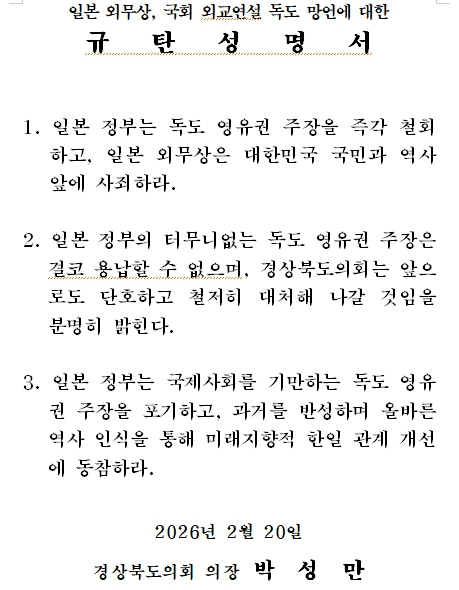 박성만 의장은 “협력을 말하면서도 독도 영유권을 주장하는 일본 정부의 이중적 태도는 결코 용납될 수 없다”며 “이번 망언은 한일 간 신뢰 회복에 찬물을 끼얹는 행위로 국제사회로부터도 비판받아 마땅하다”고 밝혔다. 이어 “이는 역사적 사실을 왜곡하고 과거 침략의 책임을 회피하려는 왜곡된 역사관의 연장선”이라고 지적했다.