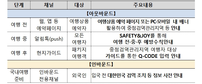 이번 업무협약은 여행자 건강 중심 검역체계 구축(’25.12월 발표)의 일환으로 추진된다. 여행객이 가장 먼저 접하는 여행사 채널을 통해 감염병·건강정보를 효과적으로 전달하고 스스로 건강을 챙기는 해외여행 문화를 확산하는데 목적이 있다.