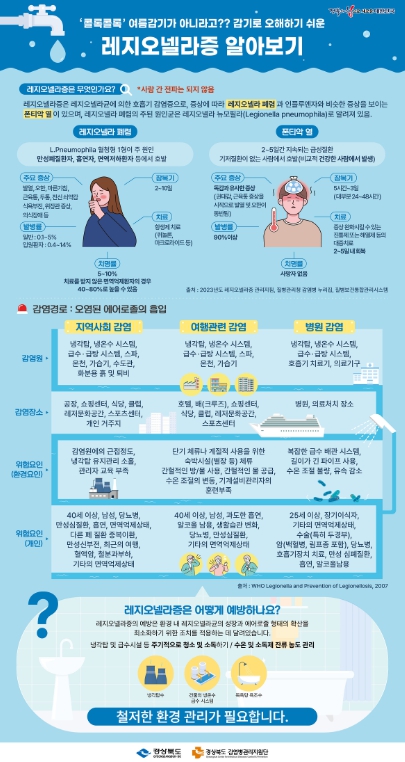 레지오넬라증은 레지오넬라균에 의해 발병하는 제3급 호흡기 감염병으로 냉방병 혹은 인플루엔자와 비슷하게 발열, 오한, 두통, 기침 등이 주 증상이며 대증요법, 항생제 등으로 치료가 가능하지만 만성폐질환자, 흡연자, 면역저하자 등이 레지오넬라균에 감염 될 경우 치명률이 급격히 상승할 수 있으므로 주의와 예방이 필요하다.