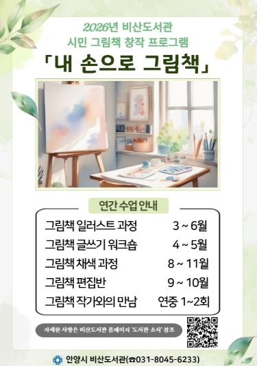 ‘내 손으로 그림책’ 프로그램은 참여자들이 직접 그림책을 만들 수 있도록 지원하는 사업으로, 3월부터 연중 진행되며 어린이부터 성인까지 전 연령의 안양시민이 참여할 수 있다.