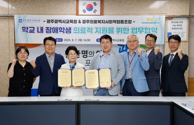시교육청과 광주의료복지사회적협동조합은 7일 본청 상황실에서 이정선 교육감, 이혜숙 광주의료복지사회적협동조합 이사장이 참석한 가운데 ‘학교 내 장애학생 의료적 지원을 위한 업무협약’을 체결했다.