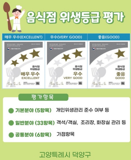 위생등급제는 음식점의 위생 상태를 평가해 ‘매우 좋음’, ‘좋음’ 등 등급을 부여하고 이를 소비자가 확인할 수 있도록 하는 제도다. 덕양구는 위생등급의 신뢰도를 높이고 지정 업소의 위생관리 수준이 지속적으로 유지되도록 사후관리를 강화할 방침이다.