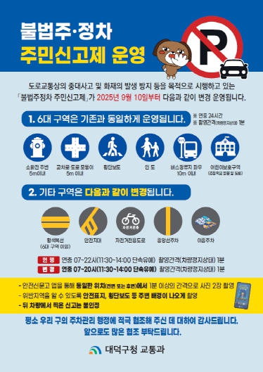 한편, 대덕구는 제도 변경사항을 구청 누리집, 동 행정복지센터, 현장 안내문 등을 통해 안내하고, 단속 민원 대응 매뉴얼도 함께 정비해 혼선 최소화에 나설 예정이다.