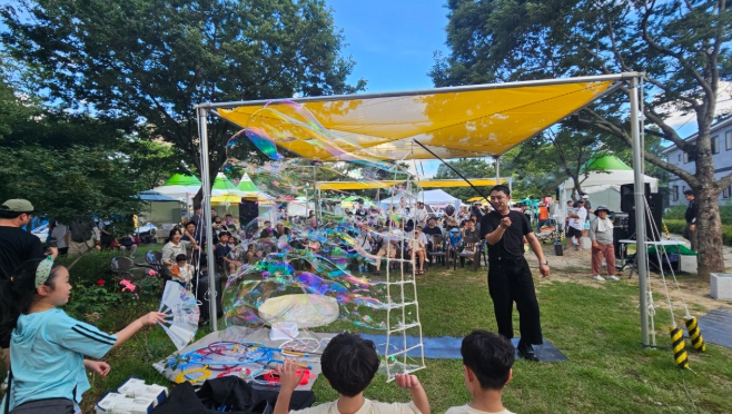 행사는 무더위를 피해 오후 3시부터 7시 30분까지 운영됐으며, 팝업 놀이터는 ▲챌린지존에서 대형젠가, 발로 밟는 피아노, 대형 컵쌓기 등 몸을 쓰며 즐기는 놀이, ▲체험존에서 물총 서바이벌이 큰 인기를 끌었고, ▲공연존에서는 버블쇼와 변극이 온 가족에게 큰 호응을 얻었다.