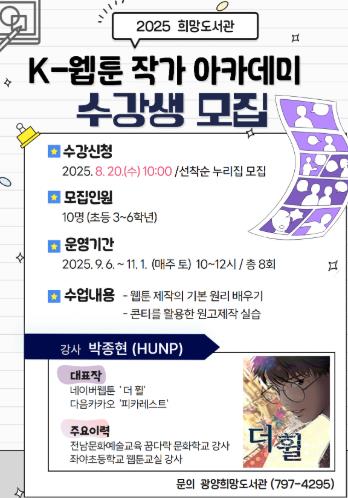 장혜정 광양희망도서관 팀장은 “하반기 프로그램은 책, 예술, 디지털을 넘나들며 어린이들이 창의력과 표현력을 기르고 미래 진로를 탐색하는 기회가 될 것”이라며 “현직 예술가와 전문가와의 만남을 통해 지역 아동들이 문화적 자신감과 성취감을 쌓기를 기대한다”고 말했다.