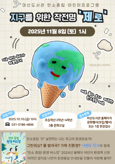이번 프로그램은 제23회 에코북 페스티벌(Eco Book Festival)에서 ‘올해의 환경 책’으로 선정된 '탄소중립! 환경 버스킹'의 저자 이명희 작가가 진행한다. 어린이들이 기후 위기와 환경 문제를 이해하고, 일상 속에서 탄소중립을 실천하는 방법을 스스로 고민하고 탐색할 수 있도록 돕는 데 중점을 두었다.