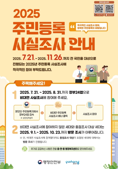 이번 조사는 주민등록지와 실제 거주지의 일치 여부를 확인하고, 복지사각지대 해소 및 각종 정책 수립에 필요한 기초자료를 확보하기 위해 추진된다.
