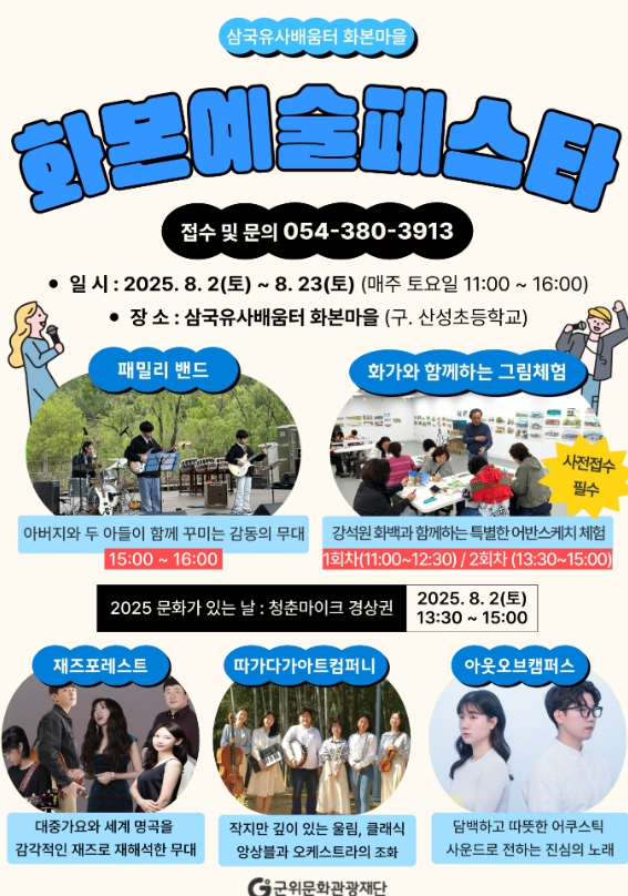 군위문화관광재단 관계자는“삼국유사 배움터, 화본마을은 지역의 역사·문화·예술이 어우러진 특색 있는 공간”이라며, “이번 행사를 통해 가족 단위 관광객과 지역 주민들이 일상속에서 문화예술의 즐거움을 경험하는 시간이 되길 기대한다”고 전했다.