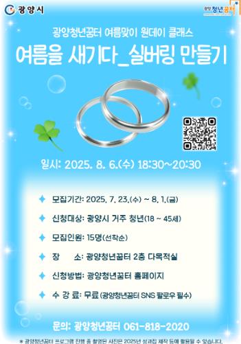 오영숙 광양청년꿈터 센터장은 “세상에 단 하나뿐인 반지를 직접 만들며, 여름의 추억을 새겨보는 뜻깊은 시간이 되길 바란다”며 “작지만 특별한 체험을 통해 청년들이 자기만의 이야기를 담아가는 시간이 되기를 기대한다”고 말했다.