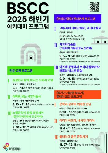 부산문화회관에 따르면 올 하반기에는 프리다 칼로 기획전시 연계 프로그램 3개 강좌, 인문교양 강좌 3개 강좌 , 클래식 교양 3개 강좌 구성하여 총 9개의 프로그램이 1차로 운영이 된다.