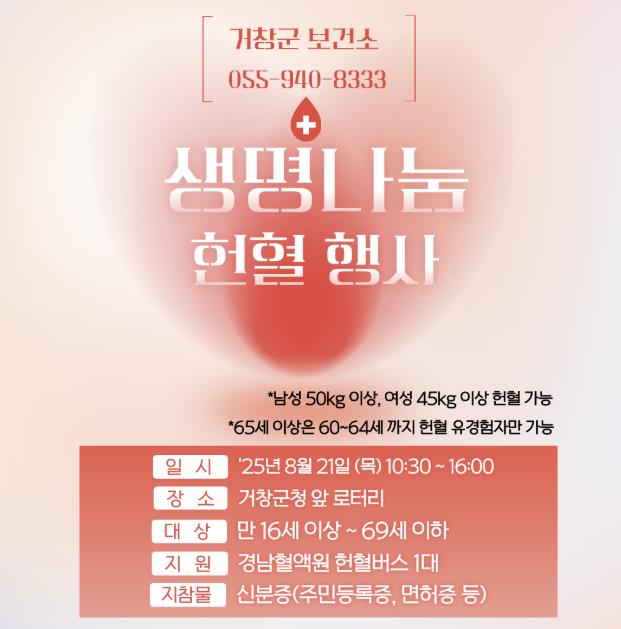거창군은 혈액 수급 불안정에 선제적으로 대응하고 군민의 생명 나눔 실천을 독려하기 위해 오는 8월 21일(목) 오전 10시 30분부터 오후 4시까지 거창군청 앞 로터리에서 ‘2025년 생명나눔 헌혈 행사’를 실시할 예정이며, 지난 1월과 4월에 각각 실시한 2번의 헌혈 행사에서 모두 144명의 군민이 참가하여 118명이 헌혈 봉사를 했다.