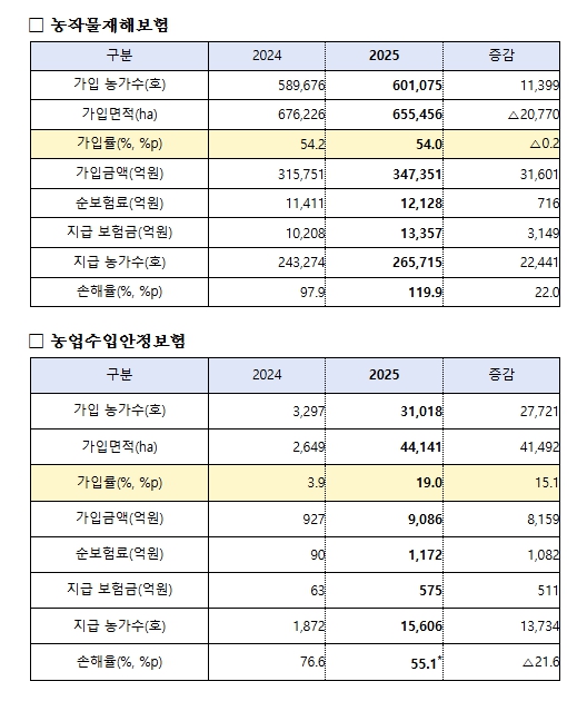 농작물재해보험은 전년 대비 2개(오이, 시설깻잎) 품목을 추가한 78개, 농업수입안정보험은 전년 대비 5개 품목(사과, 배, 노지대파, 시설대파, 시설수박)을 추가한 20개에 대해 운영할 예정이다.