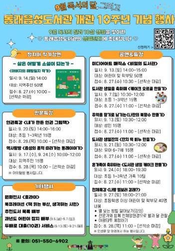 동래구 관계자는“올해는 독서의 달과 함께 동래읍성도서관 개관 10주년을 맞아 더욱 풍성한 행사를 준비했다”라며 “동래구 도서관에서 준비한 행사를 통해 주민들이 책으로 함께 소통하고 도서관에서 소중한 추억을 쌓는 기회가 되기를 바란다”라고 말했다.