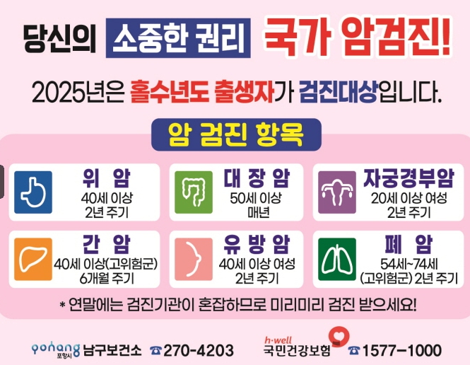 한편 포항시는 암 발생 시 취약계층(의료급여수급권자, 차상위 본인부담경감대상자) 및 소득·재산 기준에 적합한 18세 미만 소아암 환자를 대상으로 암환자 의료비도 지원하고 있다.