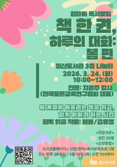 ‘책 한 권, 하루의 대화’는 계절별로 어울리는 다양한 책으로 이야기를 나눠보는 원데이 독서모임 프로그램으로, 봄 편을 시작으로 여름·가을 편이 이어질 예정이다.