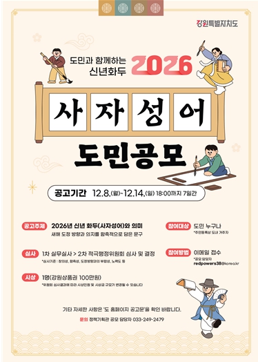 공모기간은 12월 8일부터 14일까지 진행되며, 강원특별자치도에 주민등록을 둔 도민이면 누구나 참여할 수 있다.