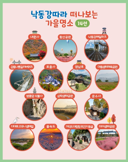 낙동강협의회 회장인 나동연 양산시장은 “이번 가을명소 스탬프투어는 낙동강뿐만 아니라 7개 지자체의 대표 관광지를 다채롭게 즐길 수 있도록 구성했다”며 “가을에도 스탬프투어를 시작으로 낙동강협의회의 다양한 공동협력 이벤트가 준비된 만큼 많은 관심과 참여를 기대한다”고 전했다.