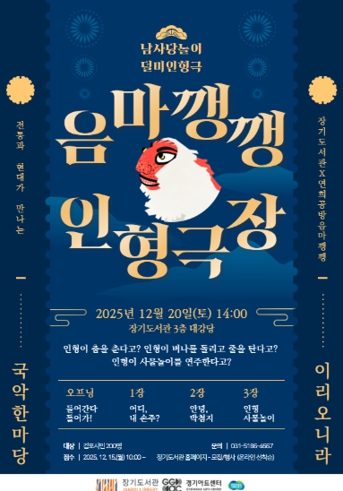 공연진 ‘연희공방 음마깽깽’은 남사당놀이를 기반으로 전국에서 활발히 활동해 온 국악 전문 예술단체로, ‘연희도깨비’, ‘괴물도감’ 등 다양한 국악공연을 진행해왔다. 이번 공연은 전통 덜미인형이 등장하는 옴니버스 형식으로 남사당놀이의 흥겨움과 즐거움을 현대적으로 재해석했다. 음악과 몸짓이 어우러진 관객 참여형 사물놀이 인형극과 실제 연주자와 덜미인형이 함께하는 무대로 관객 모두에게 특별한 재미를 줄 것으로 기대된다.