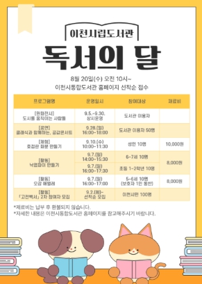 ‘독서의 달’ 프로그램은 이천시도서관 통합회원이라면 누구나 참여할 수 있고, 수강 신청은 8월 20일 오전 10시부터 이천시통합도서관 누리집 문화행사 메뉴를 통해 선착순으로 할 수 있다.