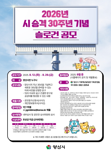 나동연 양산시장은 “시 승격 30주년은 시민 모두가 함께 축하하고 새로운 도약을 다짐하는 뜻깊은 해”라며 “시민 여러분의 창의적인 아이디어가 양산시의 미래 30년을 밝히는 힘이 될 것”이라며 많은 관심과 참여를 당부했다.