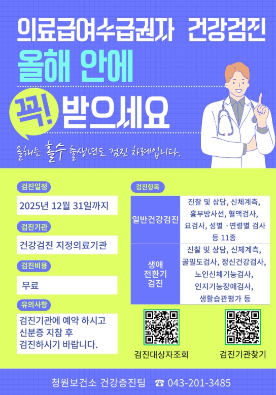 의료급여수급권자 중 홀수년도 출생자는 지정된 검진 기관에서 본인부담금 없이 일반건강검진과 국가 암검진을 무료로 받을 수 있다.