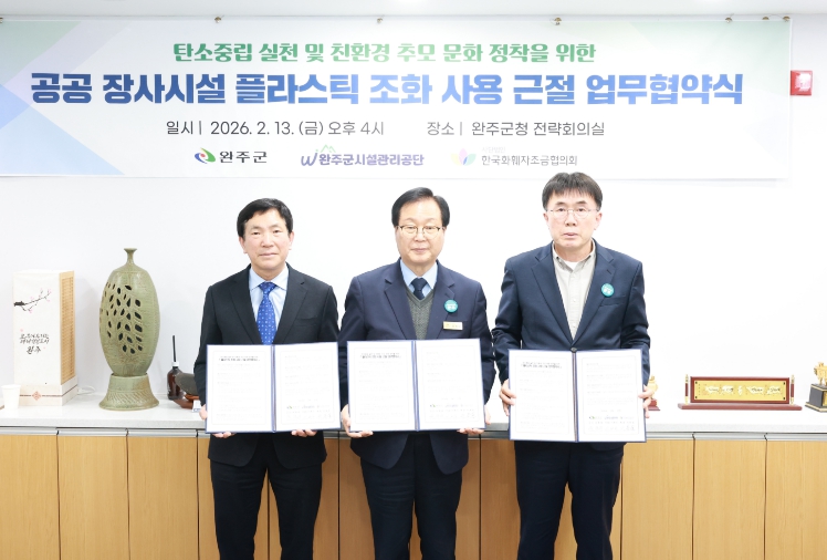 13일 완주군은 군청 전략회의실에서 (사)한국화훼자조금협의회, 완주군시설관리공단과 함께 ‘플라스틱 조화 근절 및 생화 헌화 문화 정착을 위한 업무협약(MOU)’을 체결했다.