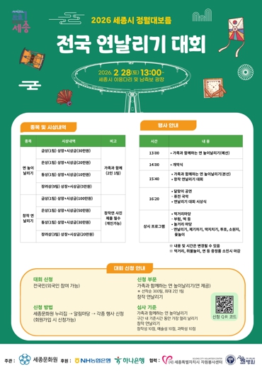 세종특별자치시는 세종문화원 주관으로 ‘2026년 세종시 정월대보름 전국 연날리기 대회’ 참여자를 모집한다고 밝혔다.