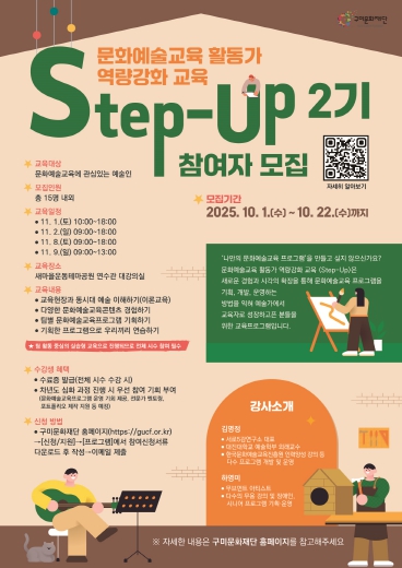 이번 2기 교육은 11월 1일(토)부터 9일(일) 사이 주말(토·일) 4일간 새마을운동테마공원 연수관 대강의실에서 진행하며, 총 14교시를 모두 수강할 시 수료증이 발급된다. 모집 대상은 구미에서 거주하거나 활동 중인 예술인으로 예술 장르와 연령 제한은 없다.
