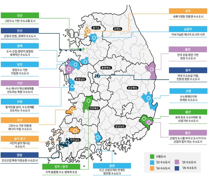 수소도시 조성사업은 ’20년 울산, 안산, 전주·완주를 대상으로 한 시범사업을 시작으로, 현재 총 15개 시・군에서 활발히 추진되고 있다.