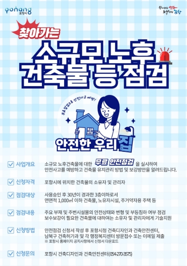 포항시 관계자는 “소규모 노후 건축물은 시민 생활과 밀접한 만큼 체계적인 관리가 중요하다”며 “이번 점검을 통해 안전 사각지대를 해소하고 시민들이 안심하고 생활할 수 있는 도시 환경을 조성하겠다”고 말했다