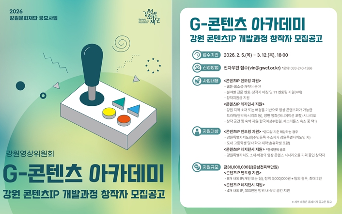 신현상 강원문화재단 대표이사는 “강원 지역의 이야기와 자원이 창작자의 아이디어를 만나 경쟁력 있는 콘텐츠IP로 성장할 수 있도록 단계별 지원 체계를 강화하고 있다”며,“이번 과정을 통해 지역에서 시작한 콘텐츠가 더 넓은 시장으로 확장할 수 있기를 기대한다”고 말했다.