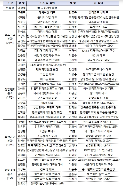 민관 정책협의회는 기업인, 민간 전문가, 학계, VC, 협·단체 등 총 72명의 위원으로 구성되어 출범일로부터 1년간 활동하게 된다. 또한 한성숙 중기부 장관과 이광재 전 국회사무총장이 공동위원장을 맡아 민관 정책협의회를 이끌어갈 예정이다.