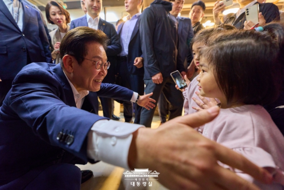 이어 명절을 맞아 딱지, 팽이 등 전통 장난감 만들기 체험을 하고 있던 아이들을 만난 이재명 대통령은 아이들과 일일이 하이파이브를 하며 인사를 나누고, 놀이를 함께했다.