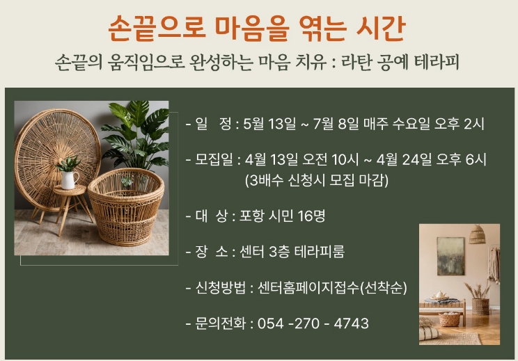 이번 프로그램에서 활용하는 ‘라탄 테라피’는 자연 소재를 활용한 촉각 자극과 반복적인 손동작을 통해 현재의 감각에 집중하게 함으로써, 심리적 안정감과 자기 조절 능력을 키우는 데 기여할 것으로 기대된다.