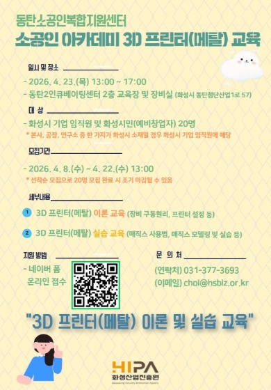 1회차 교육은 4월 23일 동탄 소공인복합지원센터에서 운영되며, ▲3D 프린터(메탈) ▲ 매직스 및 전처리 등의 주제로 이론과 실습을 병행해 수강생들의 현업 적용을 지원할 예정이다.