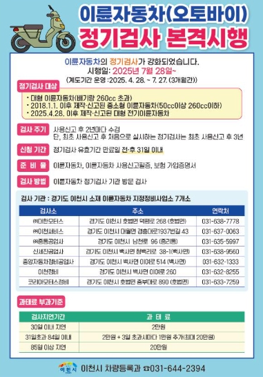 검사는 한국교통안전공단 지정 민간검사소(이천 소재 지정 정비사업소 7곳)에서 가능하며, 검사 시에는 이륜자동차, 사용신고필증과 보험가입증명서를 지참해야 한다. 정기 검사제도 관련한 사항은 이천시청 차량등록과를 통해 확인할 수 있다.