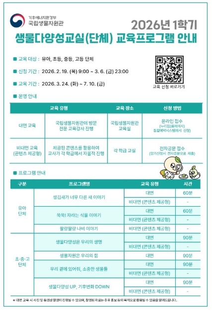유호 국립생물자원관장은 “미래세대가 생물다양성의 가치를 이해하고 실천할 수 있도록 다양한 교육과정 개발과 대상별 맞춤형 교육을 지속적으로 확대해 나가겠다”라고 밝혔다.