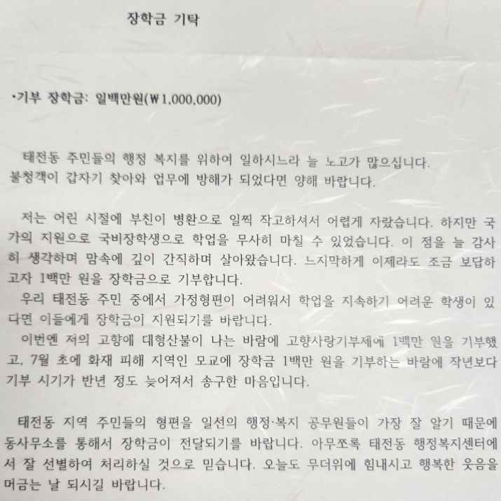 지난 7월 30일 태전1동행정복지센터에 중년의 남성이 찾아와 현금과 편지가 담긴 봉투를 내밀며 “형편이 어려운 학생들을 위해 익명으로 장학금을 기탁 하고싶다”며 돌아갔다