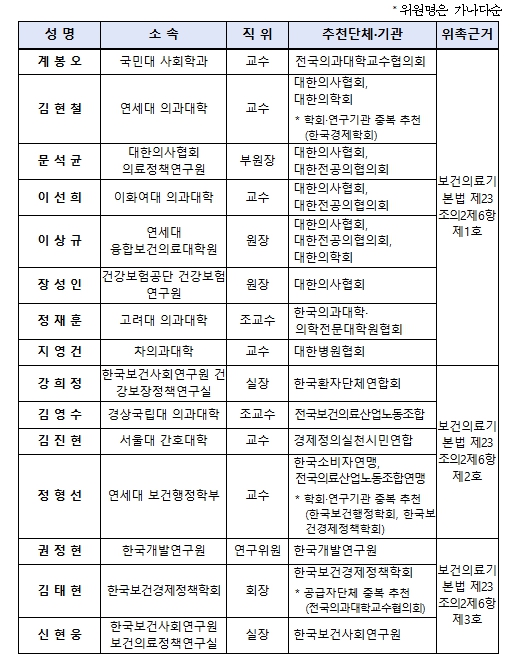 총 15명의 위원 중 공급자단체 추천위원은 8명, 수요자단체 추천위원은 4명, 학회·연구기관 추천위원은 3명으로, 보건의료기본법에 따라 공급자단체 추천위원을 과반수로 구성했다. 위원장은 추후 학회·연구기관 추천위원 중 호선할 예정이다.