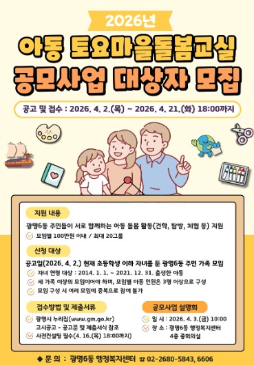 신청 대상은 광명6동에 거주하는 초등학생 이하(2014~2021년생) 자녀를 둔 주민 가족 모임이다. 세 가족 이상 모임이어야 하며, 전체 아동 인원은 3명 이상으로 구성해야 한다.